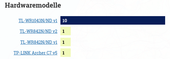 Auf die 1.4.0~192 haben sich 377 Knoten bereits aktualisiert, 245 Knoten im ›deadend‹-Zweig (4/32er-Geräte ohne Zukunft), 120 im Bereich ›exterritorial‹ genutzter Firmware des Freifunks Lippe (da erfolgt die Aussonderung nach ›deadend‹ erst später) sowie 12 Knoten im ›stable‹-Branch — wobei sich Fragen ergeben, denn einige der ›stable‹-Geräte hätten längst anders einsortiert worden sein sollen …